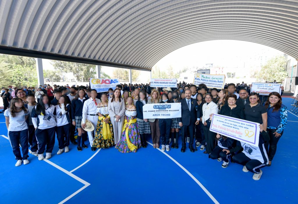Durante el evento en el que el Presidente Municipal, Pedro Rodríguez Villegas, hizo entrega del arcotecho en este plantel educativo, Paty Arévalo destacó la importancia de trabajar en la salud mental y emocional de los estudiantes, ya que esto impacta directamente en su aprovechamiento escolar.