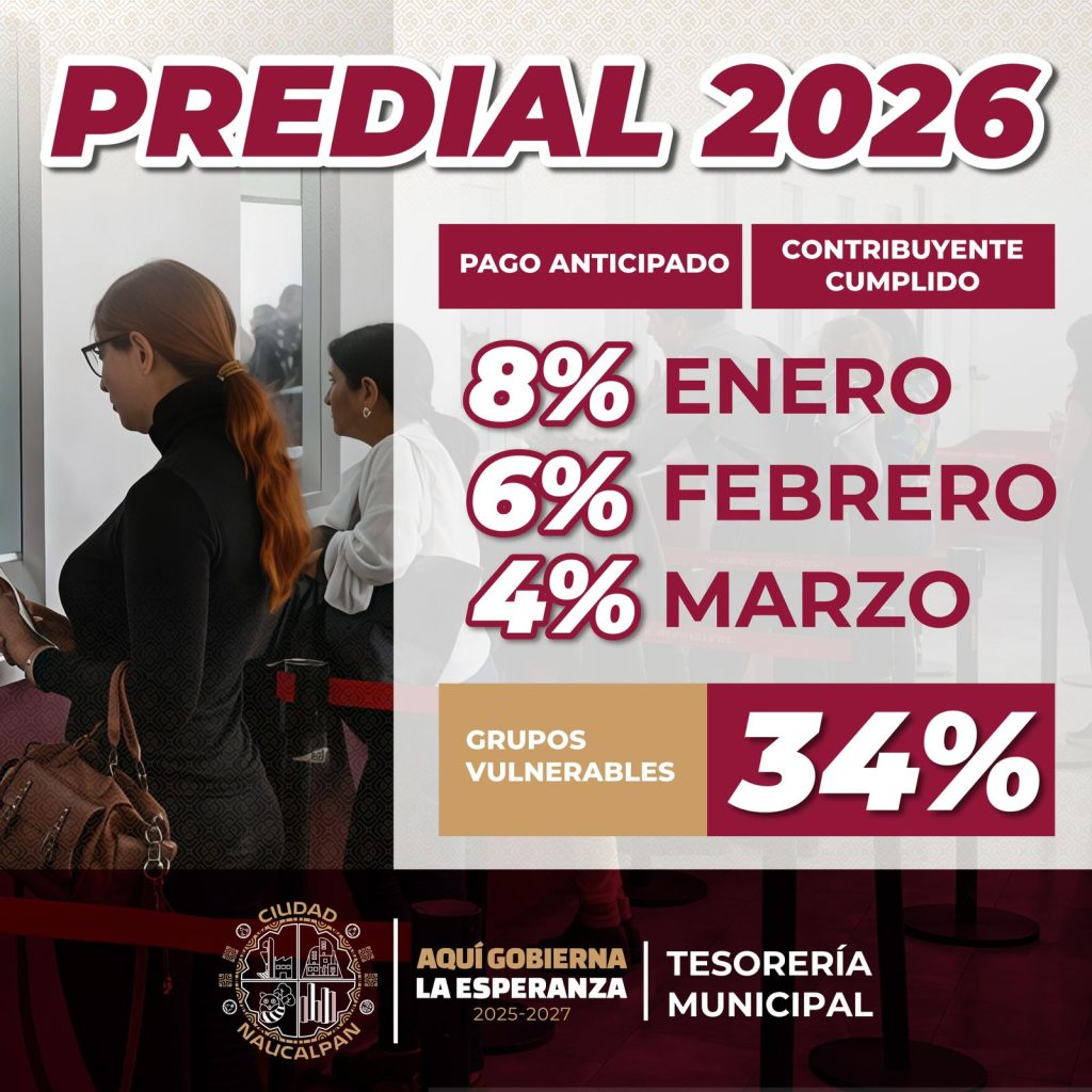Naucalpan, Méx.- El Gobierno Municipal de Naucalpan, encabezado por el alcalde Isaac Montoya Márquez, invita a las y los contribuyentes a beneficiarse con las bonificaciones propuestas y aprobadas por el Cabildo en el pago del impuesto predial y agua potable desde este 2 de enero de 2026. Habrá beneficios de 8%, 6% y 4% por pago anual anticipado y por cumplimiento del impuesto predial y de agua durante los meses de enero, febrero y marzo respectivamente.