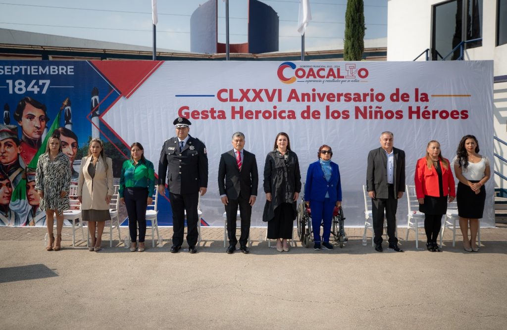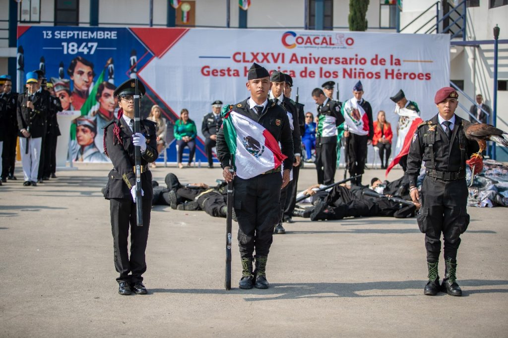 Coacalco, Méx.- Con una ceremonia cívica en la Comisaría de Seguridad Pública y Tránsito Municipal de Coacalco, David Sánchez Isidoro, presidente de Coacalco encabezó la conmemoración del 176° Aniversario de la Gesta Heroica de los Niños Héroes en Chapultepec, en la que hizo un llamado a niñas, niños y jóvenes a guiarse con los valores de la disciplina y la lealtad; así como a honrar a sus padres y profesores.