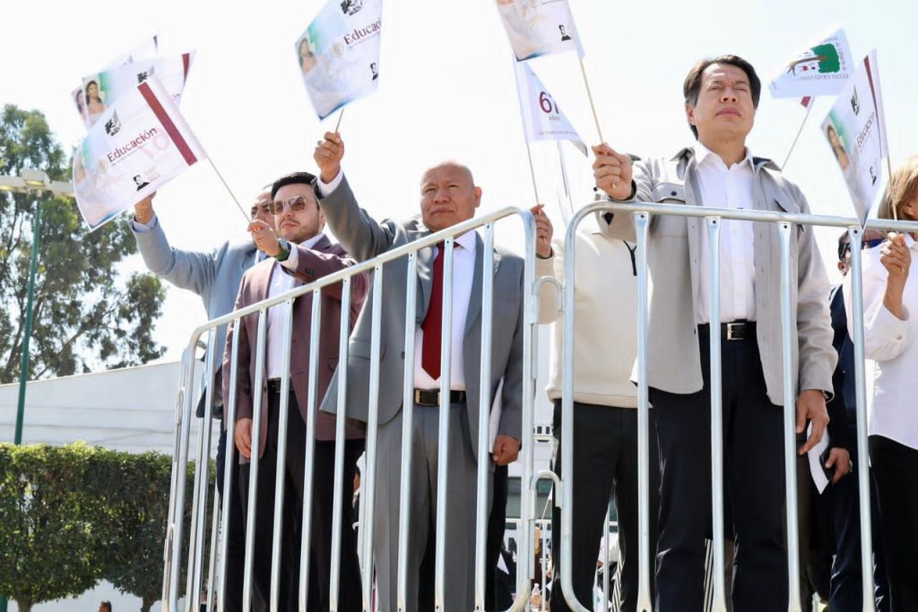 - El secretario de Educación Pública, Mario Delgado Carrillo, encabeza la ceremonia junto a la directora Victoria Guillén Álvarez y el alcalde Raciel Pérez Cruz.