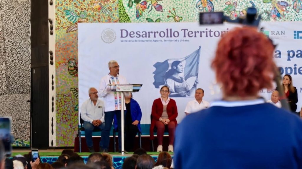 En el evento realizado en el Teatro Algarabía ubicado en la plaza central del municipio, cientos de mujeres y sus respectivas familias, así como vecinas y vecinos, recibieron a las autoridades federales, estatales y municipales, encabezadas por la titular de Desarrollo Agrario, Territorial y Urbano (SEDATU), Edna Elena Vega Rangel; el Director General del Registro Agrario Nacional (RAN), Luis Cruz Nieva, y el Presidente Municipal, Raciel Pérez Cruz.