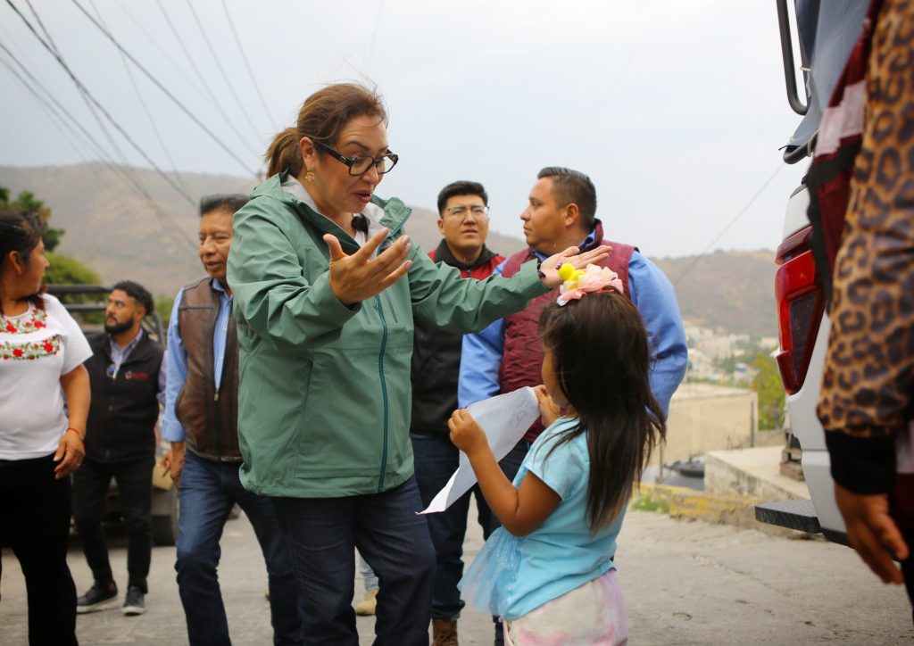 “Estamos hasta donde se toca el cielo con las manos. Estamos en la zona alta de La Cañada, es un rincón cerca del cielo”, afirmó la alcaldesa de Ecatepec en calle Puerto del Gallo, acompañada de vecinos de Arboledas Xalostoc, La Cañada, La Agüita, Los Bordos, Tablas del Pozo y otras colonias de la zona.
