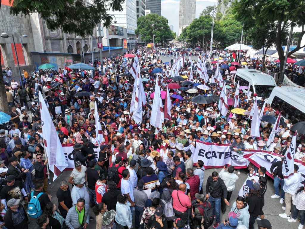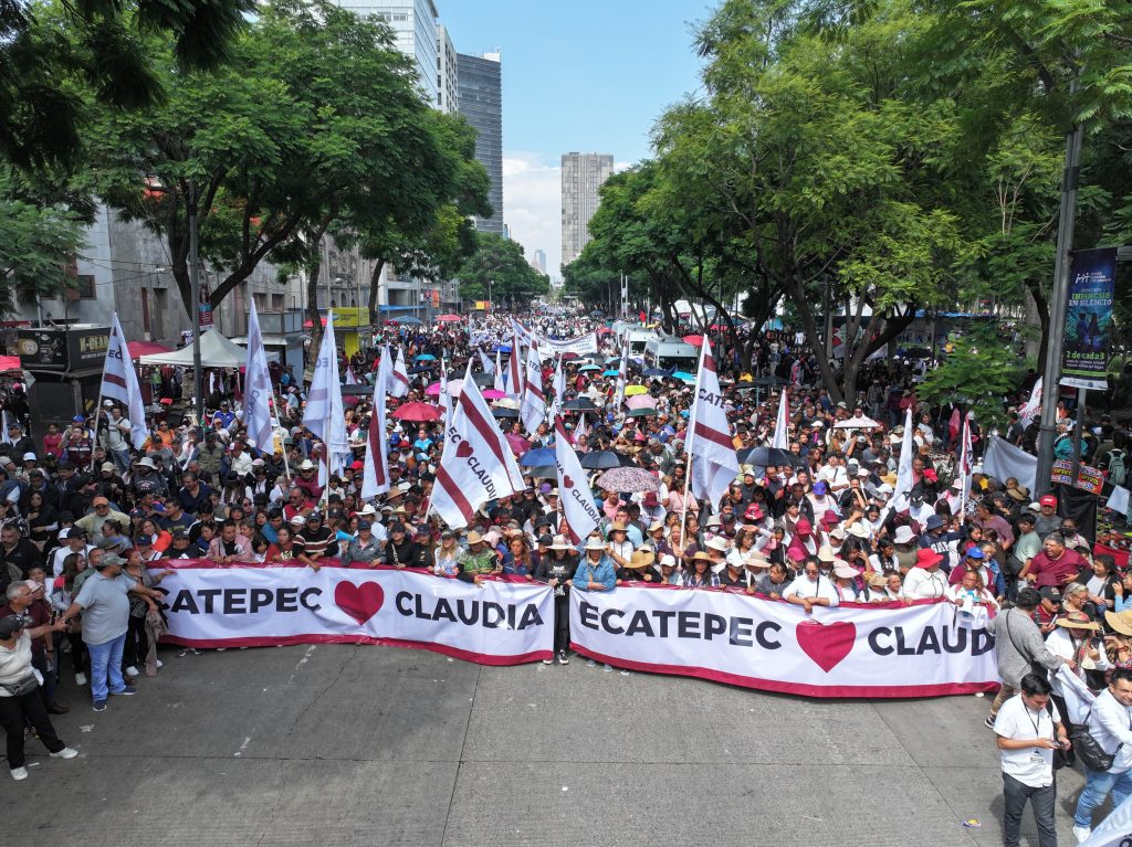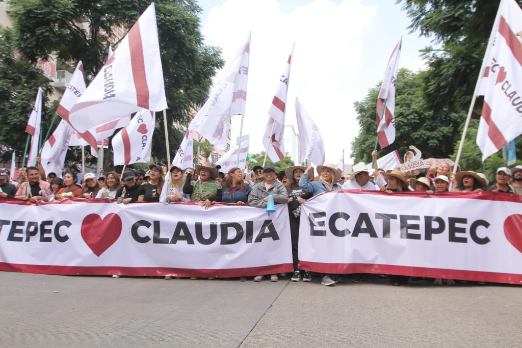 Con una manta que decía “Ecatepec ama a Claudia”, el contingente de miles de personas coreaba ¡E, E, Ecatepec!, ¡Claudia!, ¡Presidenta!, ¡Es un honor estar con Claudia hoy!, ¡Se ve, se siente, Azucena está presente! al tiempo que ondeaban banderas.