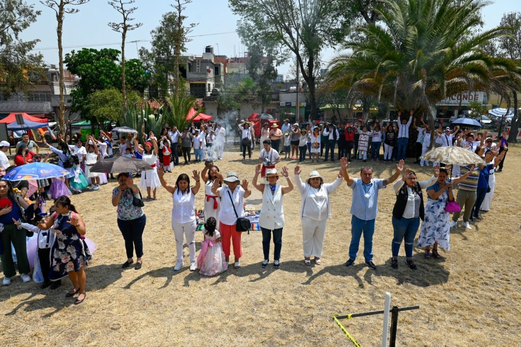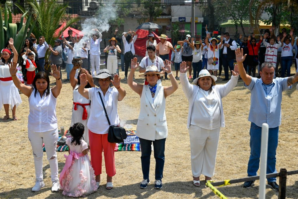 Naucalpan, Méx.- Vecinos y autoridades auxiliares, participaron en una ceremonia prehispánica acompañados por la presidenta municipal para dar la bienvenida a la primavera en la pirámide ubicada en la Zona Arqueológica El Conde y así agradecer por un ciclo más de vida.