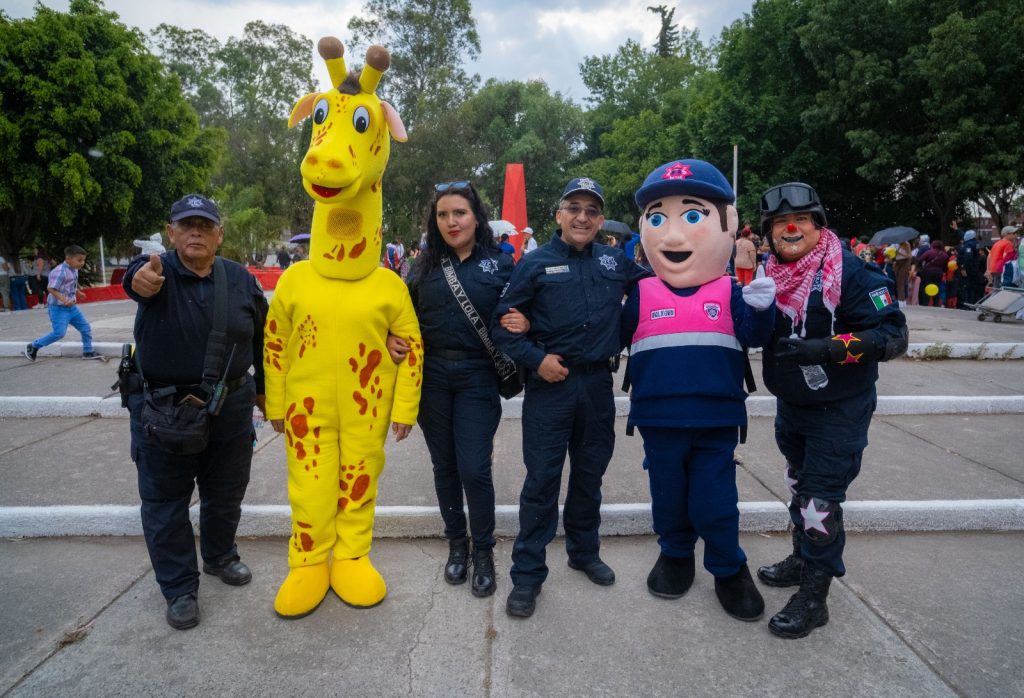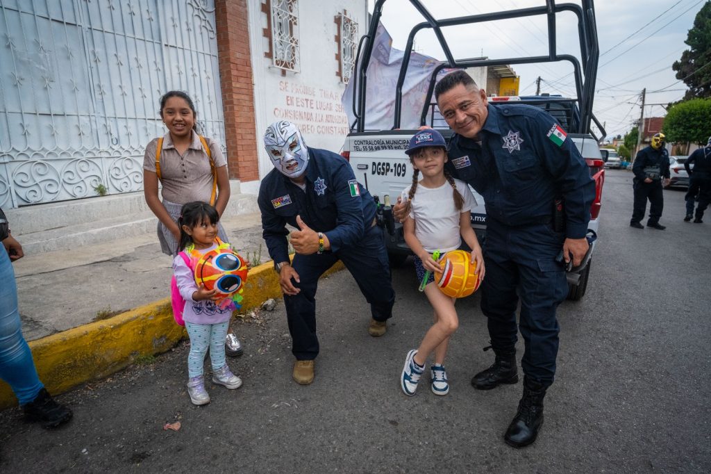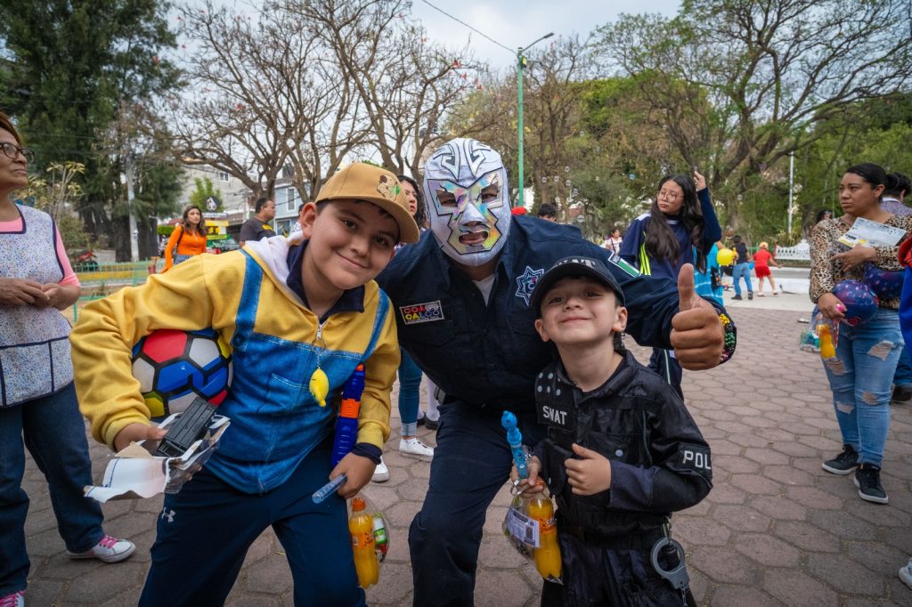 Durante el recorrido, algunos elementos lucieron máscaras de luchadores, mientras que otros ofrecieron espectáculos de payasos y botargas, animando a las y los infantes a participar en concursos. En cada punto, los asistentes aprovecharon la oportunidad para tomarse fotos con los uniformados y disfrutar de una celebración llena de alegría y sorpresas.