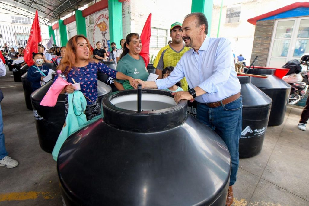En la colonia Emiliano Zapata, en la calle Jorge Jiménez Cantú esquina con Miguel Domínguez, el munícipe y su comitiva, en conjunto con la Dirección de Desarrollo Social, proporcionaron 66 tinacos a personas de escasos recursos que no pueden comprar un contenedor de grandes dimensiones.
