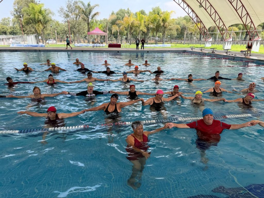 Asimismo, como parte de las acciones de inclusión y bienestar, se llevó a cabo una convivencia acuática en la alberca del Parque Ecológico y Deportivo Sierra Hermosa, donde más de 70 adultos mayores participaron en actividades de activación física, durante la jornada se promovió el cuidado de la salud mediante la entrega de glucómetros y medicamentos para el bienestar articular.
